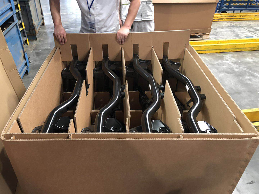 重載型五層瓦楞箱,采用AAA級(jí)牛卡紙+蜂窩加固結(jié)構(gòu),通過(guò)汽車(chē)物流TL/SL測(cè)試標(biāo)準(zhǔn)。內(nèi)置分隔襯板,可固定發(fā)動(dòng)機(jī)/變速箱等不規(guī)則部件。